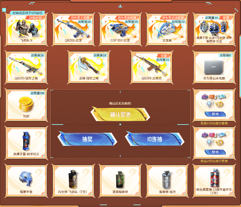 首先是16周年奖池,8月10日至11日游戏一局可直接领取16张抽奖券。之后累计游戏2、3、5天以及观看CFPL夏决,还能领取抽奖券。其中抽奖20次必出飞虎队-X,他的经典语音也将于9月份回归。更有云龙系列武器、冠军之薇、QBZ03-文殊坊等豪华奖励在等着我们。