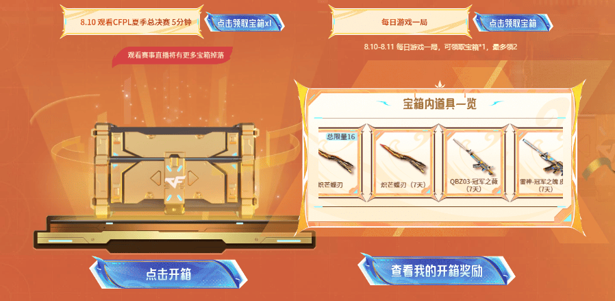 活动期间通过每日游戏、在8月10日观看CFPL夏决,还可领取电竞神秘宝箱。其中的头奖为炽芒蝶刃,同时更有冠军系列的多款皮肤亮相其中。16周年嘉年华名片、喷涂以及N9签名版均亮相其中,大家可以开箱拿奖励喔!