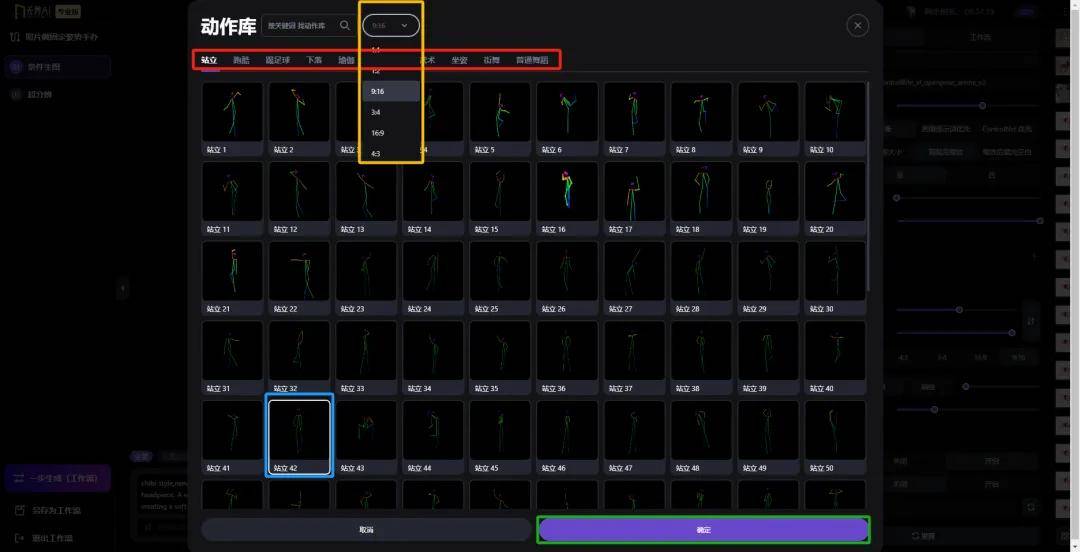 需要注意的是,同样的动作也有不同的「长宽比例」需要选择。小编选择了「站立42」,比例位「9:16」: