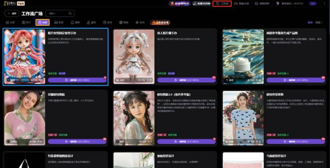 首先打开无界AI专业版,点击右上角「工作流」,在「电商」类别中选择「照片转绘固定姿势手办」工作流:
