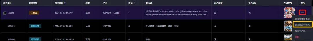 一键同款后,页面就会自动跳转到这里。我们选择刚刚同款的工作流,在「操作」栏下面点击「…」,选择「此参数前往操作」: