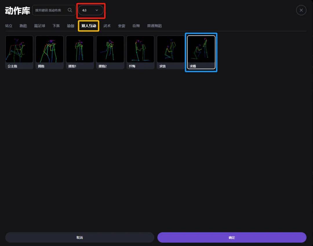 「动作库」选择,双人互动-求婚: