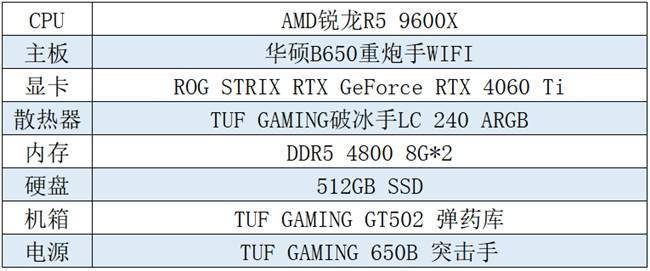 接下来为大家推荐一套高性价比的锐龙9000电竞主机,包含了华硕B650重炮手WIFI主板、AMD R5 9600X处理器、ROG STRIX RTX GeForce RTX 4060 Ti显卡等高品质硬件,给予玩家浑然一体的美学感受和超凡的游戏体验!