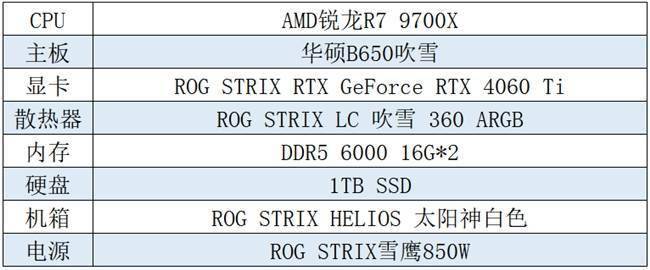 首先为大家推荐一套颜值与性能并存的锐龙9000潮流电竞平台,以华硕B650吹雪主板(ROG STRIX B650-A GAMING WIFI)为核心,搭配AMD R7 9700X处理器、ROG STRIX RTX GeForce RTX 4060 Ti显卡等令潮流电竞玩家心动的电竞装备,可高画质顺畅运行各类大作,并带给玩家无与伦比的整机灯效和游戏体验!