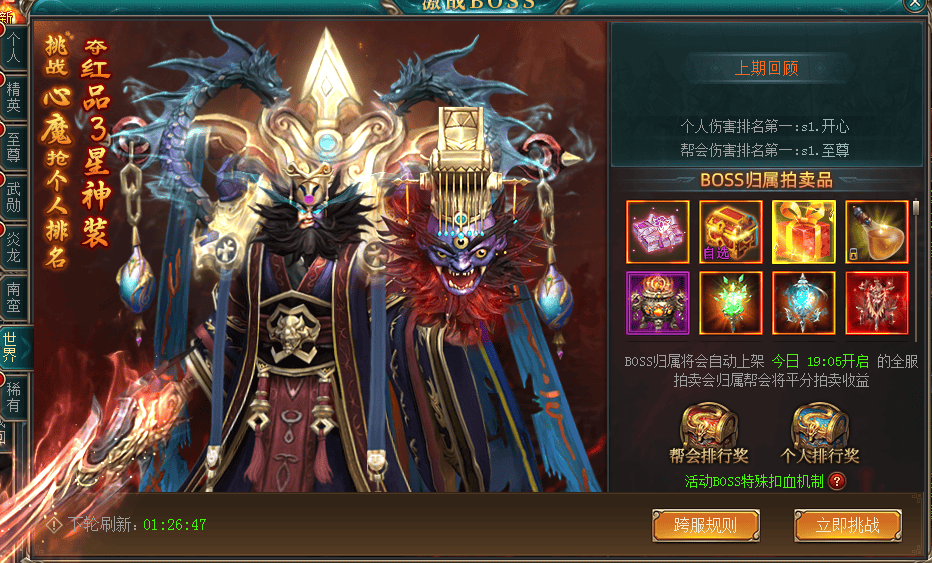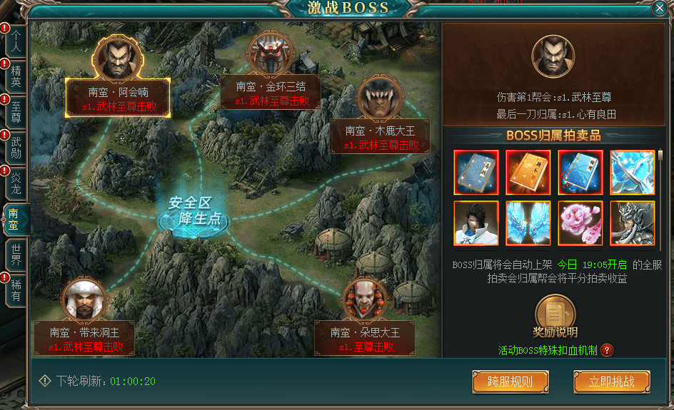 l 每关均有守关大BOSS,击败可获取稀有坐骑、换血丹奖励,守关大BOSS仅在活动开启前半小时刷新,最后一层BOSS被击败后不会刷新