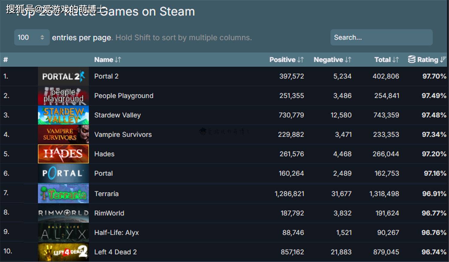 上述问题其实比较难回答,毕竟Steam上“好评如潮”的产品实在太多了,一个人想要汇总整理这些数据难度极大。不过,有第三方数据统计网站帮助我们做了上述的事情,博士个人觉得SteamDB的好评榜就比较靠谱,每款游戏好评率的计算并非是简单的好评数量除以评论总数量得出,而是有一套自己的公式(考虑了无效评论、反串评论等等)。