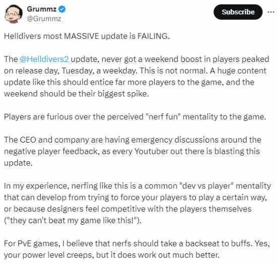 前《魔兽世界》团队负责人@Grummz指出,玩家们对游戏中所谓的“削弱乐趣”心态感到愤怒。“根据我的经验,像这样的削弱是一种常见的‘开发者与玩家’心态,这种心态可能源于试图强迫玩家以某种方式玩游戏,或者因为设计师觉得自己与玩家有竞争关系(‘他们不能这样通关我的游戏!’)。”
