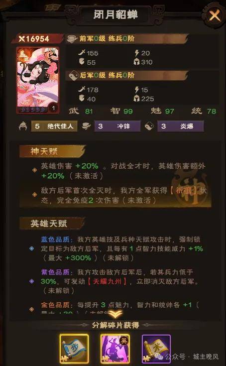 本期庆典主英雄是【闭月貂蝉】,还是老样子累充获得英雄碎片,其他道具奖励根据赛季情况变化。赛季高区服是夺魄闪影的兵法技能碎片。特殊宝石本期是白虎智力抗暴宝石。城主天下内部号福利嘉威cztx009