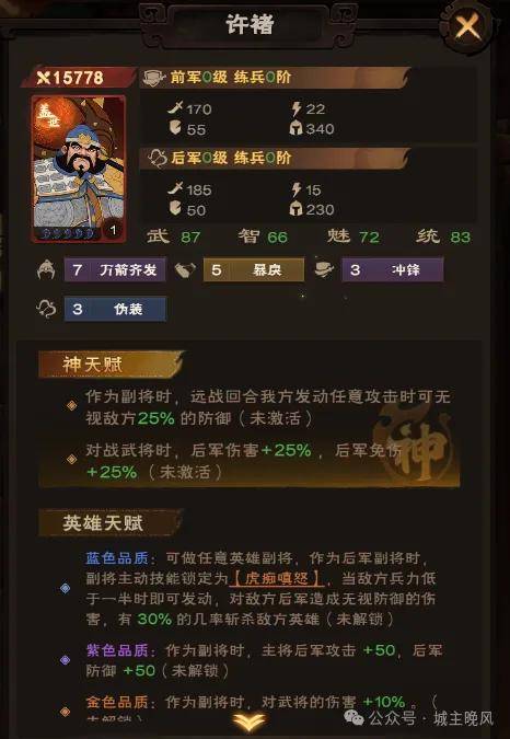 英雄限定直购是副将【许褚】,许褚拥有特殊的斩杀机制作为副将就目前而言是非常好的一个选择,甚至说和他其他天赋不契合的英雄也能一样选择许褚作为副将。