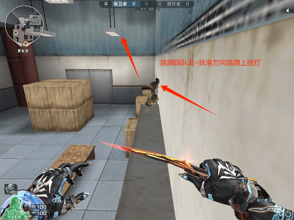 潜艇地图中,保卫者常用的卡点点位无非是更衣室右手的柜门上,以及B包点二楼,潜伏者也有许多反针对措施,例如利用闪身的空档期进行进攻或者提前拉枪攻击,进行出其不意的破点,所以这些点位实用性已经很难满足排位中不断精进的实力了。像上图展示效果,大家可以学习一下更衣室挂灯点位,进行制约潜伏者进攻!