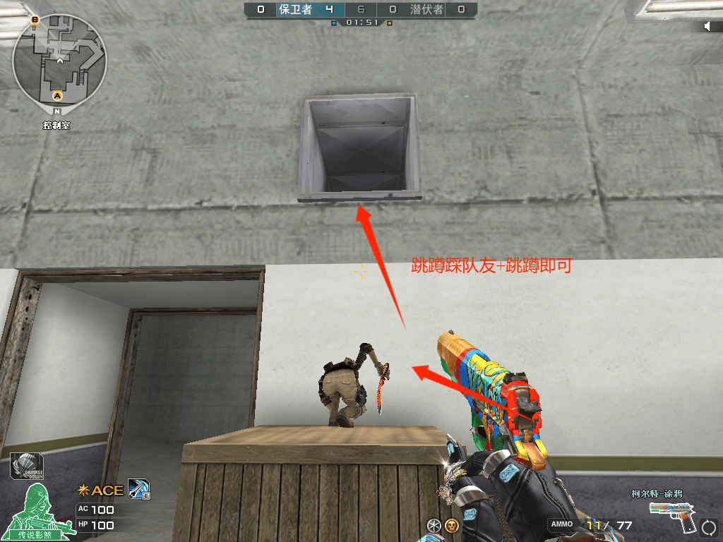 1、首先让队友跳至A仓木箱上蹲下(详情如上图)