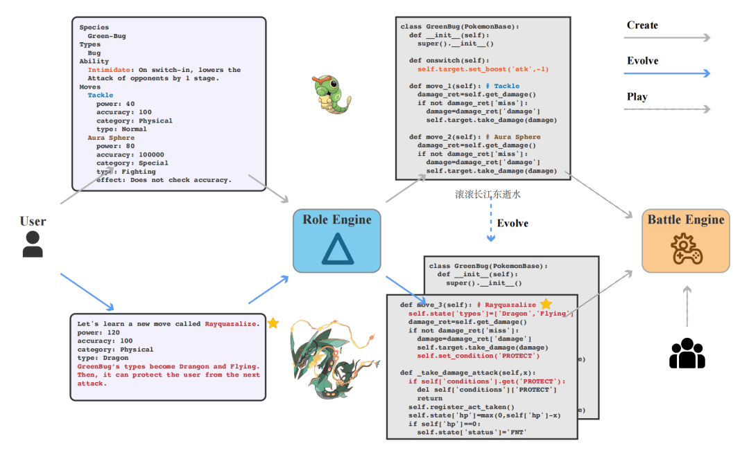 玩家首先输入自然语言,随后会被转换成对应的角色剧本。Delta-Engine接受角色剧本生成相应的角色代码。随着角色的进化,引擎也会随之膨胀。