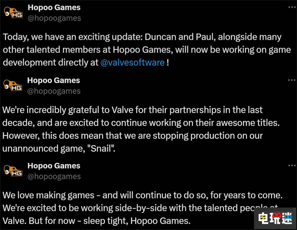 Hopoo Games官方表示联合创始人Duncan Drummond和Paul Morse以及“其他才华横溢的成员”都将直接在《半条命》与《反恐精英》开发商Valve进行游戏开发。Hopoo Games与Valve已经有十年的合作关系,同时Hopoo Games的大家也很高兴能够参与Valve并开发他们的优秀作品。不过这也意味着Hopoo Games将停止开发未公开的游戏《Snail》。虽然不知道工作室是否会关闭,但是官方也对Hopoo Games说了“睡个好觉”。