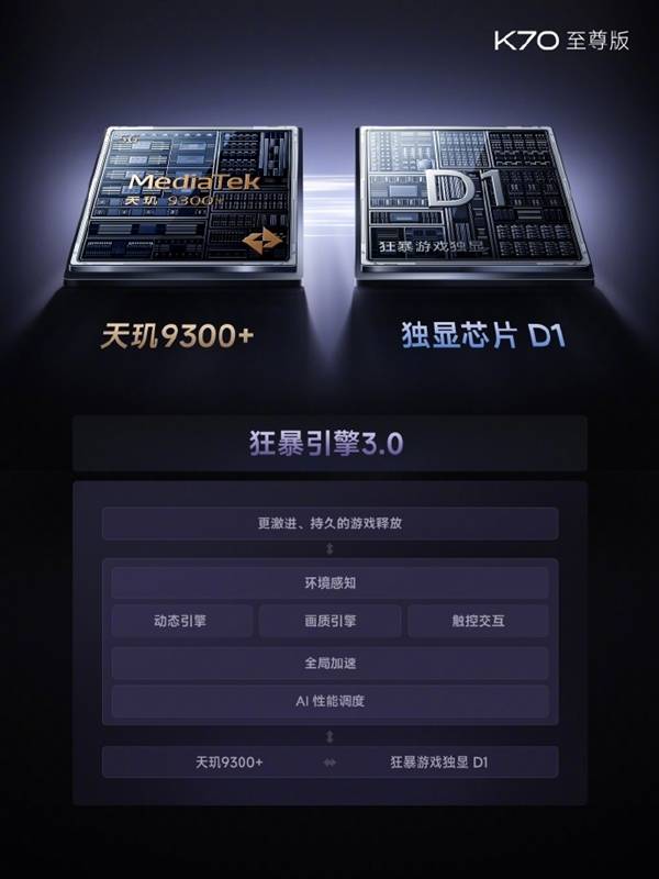 以最后发布的K70至尊版为例,该机搭载了联发科最强的天玑9300+处理器,采用全大核CPU架构,八核CPU包含4个Cortex-X4超大核,最高频率可达3.4GHz,以及4个Cortex-A720大核。