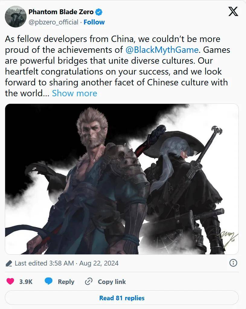 米哈游的《绝区零》,网易的《永劫无间》都是市场表现亮眼的产品。灵游坊的《影之刃:零》在参展同时还不忘发推祝贺《黑神话:悟空》的成功。看到黑神话做买断制做成了,原本在付费模式上有所犹豫的影之刃零,不知道会不会改变主意,最终下决心做买断制。