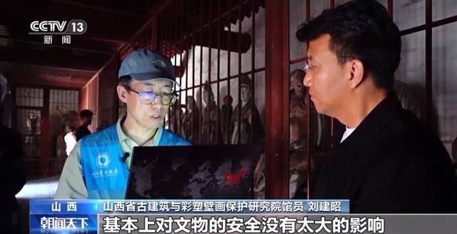 山西省古建筑与彩塑壁画保护研究院馆员刘建昭:我们在这专门放了一个温湿度跟二氧化碳的检测仪,目前来看温度跟湿度没有受到人流量影响的变化,二氧化碳的浓度小幅增高,过去大概维持在400左右,就是在人流量最高的下午的时候,最高峰能涨到500左右,涨幅大概五分之一,基本上对文物的安全没有太大的影响。