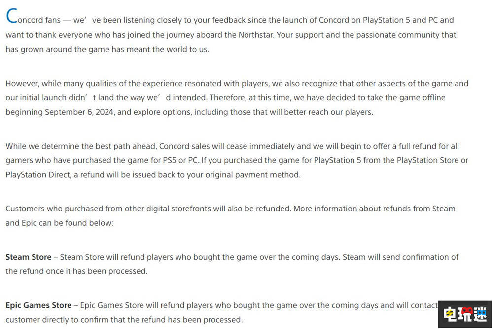 在博客中,Firewalk游戏总监Ryan Ellis表示自《星鸣特攻》在PS5与PC上推出后,官方一直在关注玩家们的反馈,并且感谢所有加入这趟旅程的玩家。然而尽管游戏体验在许多方面都引起了玩家的共鸣,但是Firewalk也意识到游戏的其他方面以及游戏首发并没有像预期中一样顺利。所以决定2024年9月6日下线游戏,并探索其他能够更好吸引玩家的选项。游戏也将立刻停止发售,同时开启退款。