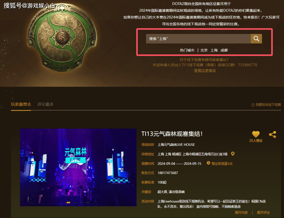 2024年国际邀请赛线下观赛点展示申请开启,想要寻找自己所在城市的TI观赛点,请前往线下观赛专题页搜索查看。