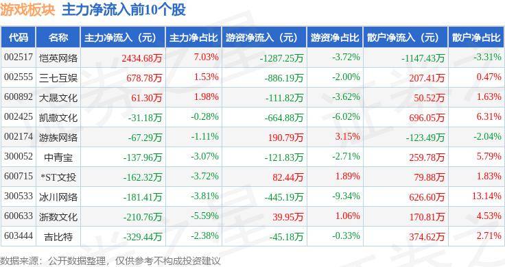 从资金流向上来看,当日游戏板块主力资金净流出2.57亿元,游资资金净流出458.87万元,散户资金净流入2.62亿元。游戏板块个股资金流向见下表: