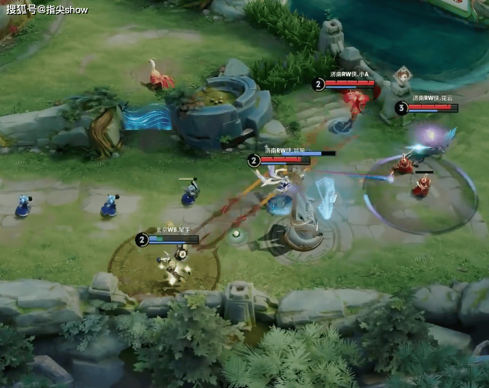 前期RW侠是崩盘的,开局杨玉环送一血,节奏断层,下路射手被压制,花云戈娅的经济和辅助装中路几乎相等,这还怎么玩?之后还被公孙离单杀在自家的野区,眼看着RW侠要废废,结果一波节奏打了回来。