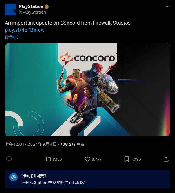 目前有玩家指出,索尼似乎并不希望玩家对这款游戏的失败进行更多的讨论。在社交媒体推特上,PlayStation 官方账号宣布游戏即将下线的公告被关闭了评论。当然这并没有阻止玩家社区通过转发或是单独发帖进行热烈的讨论。目前“Concord”已经登上了推特游戏话题榜首。