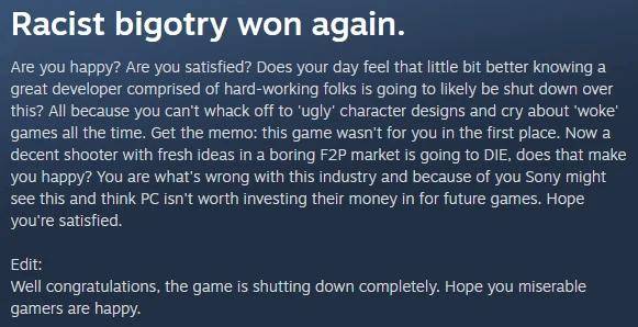 许多人都在“哭丧”,表示这是一款好游戏,只是不适合所有人。Steam 上有似乎是《星鸣特攻》的粉丝指控,游戏的关服是让“歧视和仇恨又一次胜利”,指控玩家社区由于反 LGBTQ+ 和其他游戏中“正确”的设计而攻击游戏导致的关服。实际上理性来看这单纯只是一次巨大的商业失败,与游戏的口碑无关:如果“正确”真的有那么多支持者,为什么他们没有去买游戏呢?