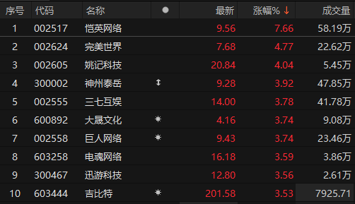 9月5日,游戏股早盘拉升。截至10时47分,恺英网络涨超7%,完美世界、姚记科技涨超4%,三七互娱、大晟文化、迅游科技等跟涨。