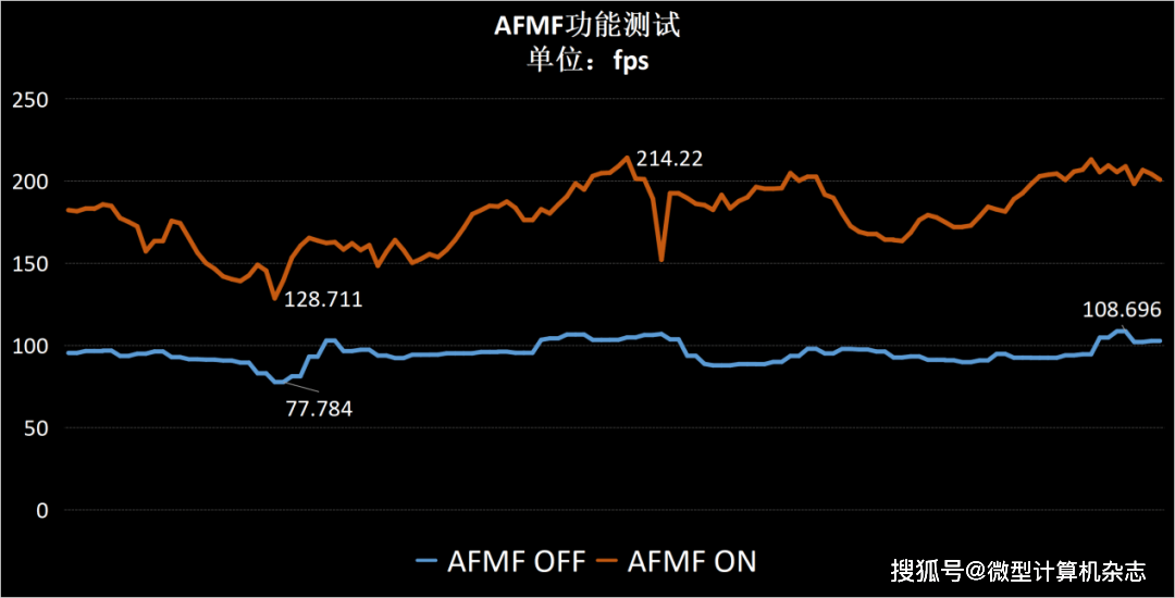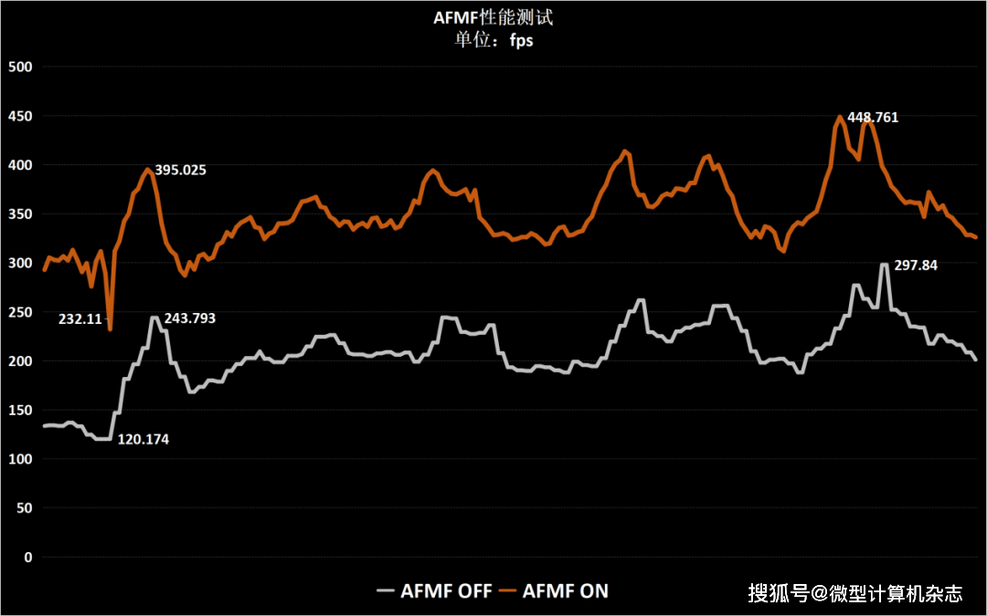 A卡的游戏表现自然还离不开AFMF的话题。在相同的飞行路线上,我们分别记录了开启/关闭AFMF的游戏性能表现。从最终结果看到,开启AFMF之后,野外飞行的平均帧率从210fps左右猛增到了340fps左右,性能增幅达近70%。这时候的游戏那是相当丝滑。