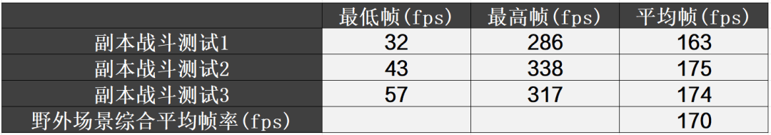 由于测试时新版本的团队副本尚未开启,因此我们用了5人副本进行了副本战斗的游戏流畅度测试。在测试过程中一共进行了三场5人副本游戏,重点记录进入副本开始到最后BOSS被击杀的整体帧率表现。必须说明的是,副本战斗帧率具有一定的不可控性和随机性,没有良好的重现性,并不如主城跑图或野外飞行那样可控,此部分测试数据仅供大家参考。