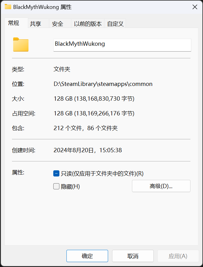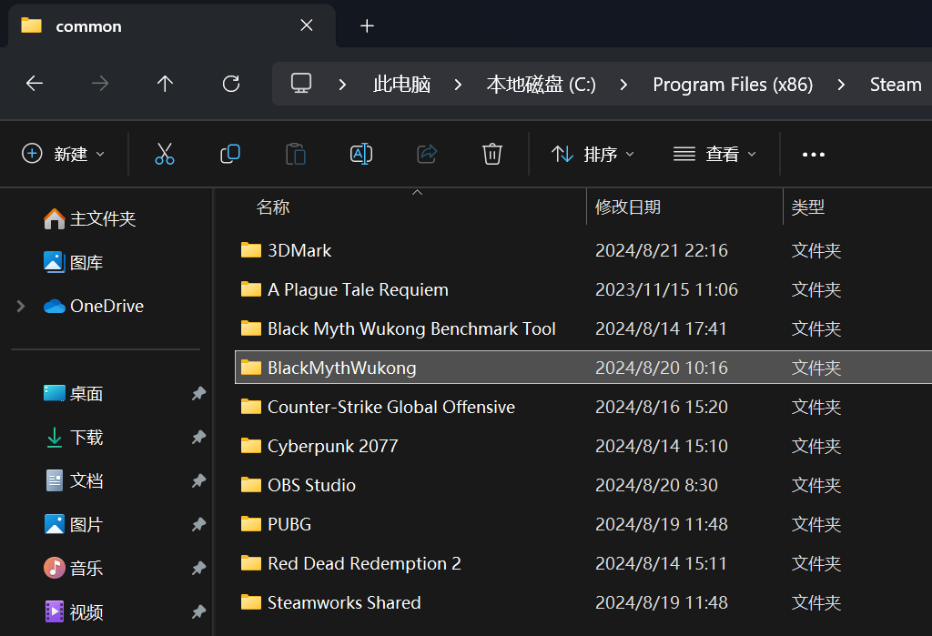 就是common中的这个BlackMythWukong这个文件夹,将其复制到三星T9中的SteamLibrary\steamapps\common目录中。