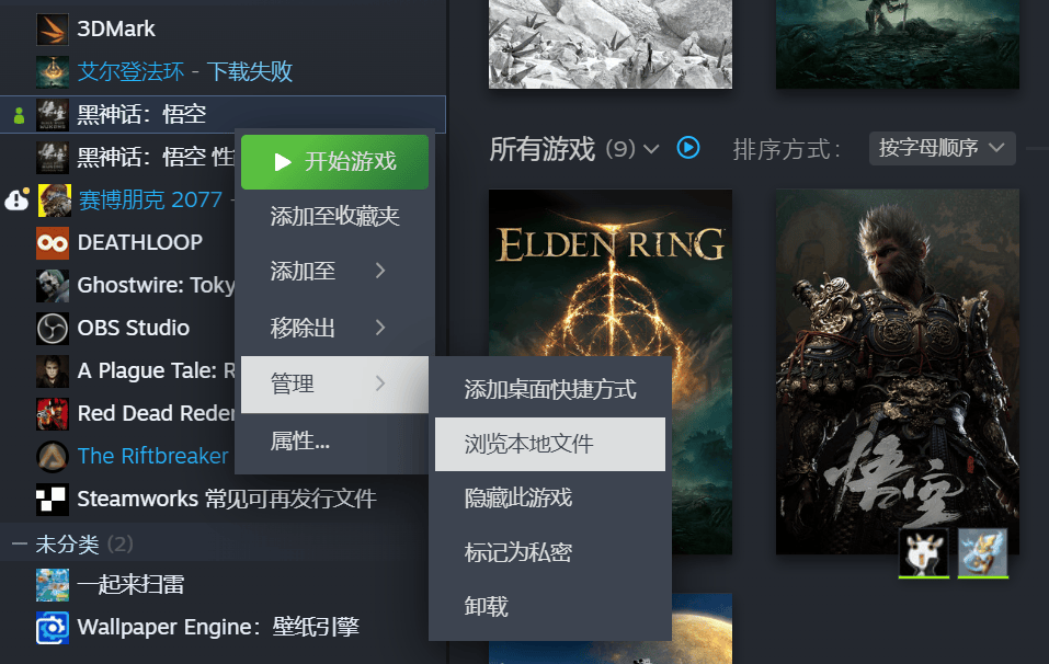 第二步,在Steam中右键单击《黑神话:悟空》,选择“管理”--“浏览本地文件”,即可打开其所在的文件目录。