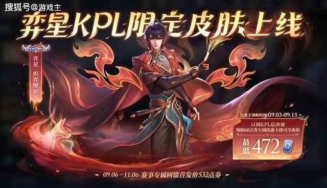9月6日至11月6日,会上架弈星的KPL限定,名字叫做“炽弈燎原”,品质为史诗限定,首周价格是532点券。