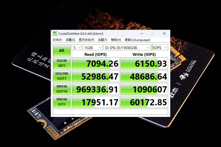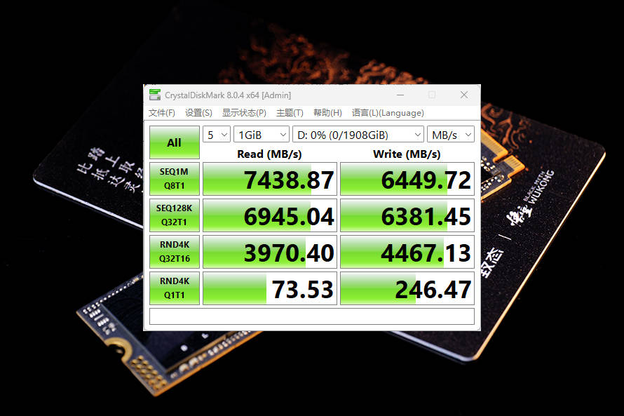 除了针对《黑神话:悟空》进行了一系列测试,我们还对致态TiPlus7100悟空联名版进行了常规测试,首先是大家最熟悉的Crystal DiskMark,顺序读写速度达到7438.87 MB/s,6449.72 MB/s,两项数值均高于官方标称的7000 MB/s读以及6000 MB/s写,而且超出的幅度非常之大,达到了400 MB/s+,表现相当不错。