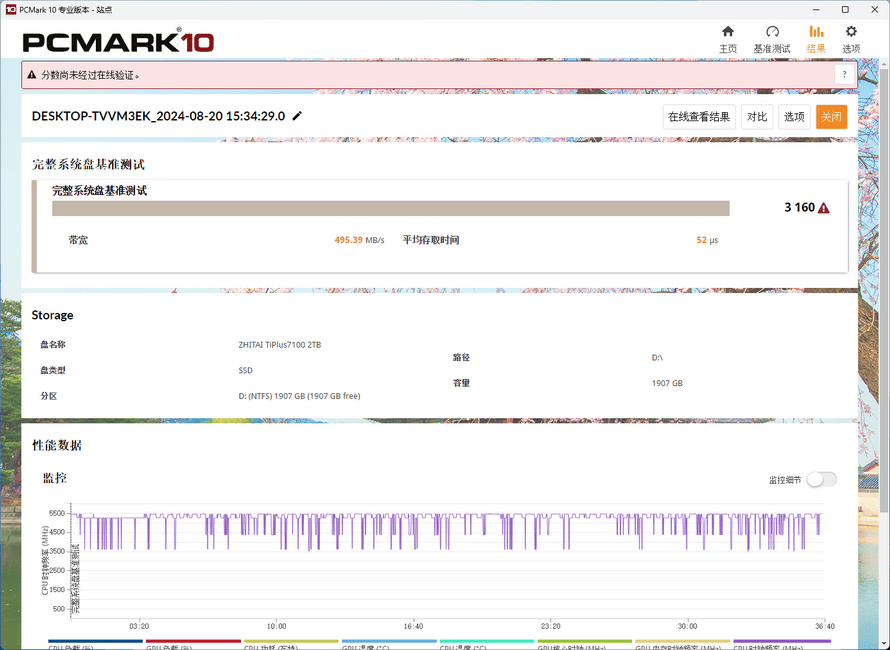 下一项测试是大家熟悉的PCMARK10与3DMARK,PCMARK10使用了完整系统盘基准测试,实测带宽为495.39 MB/s,平均存取时间为52毫秒,得分3160。