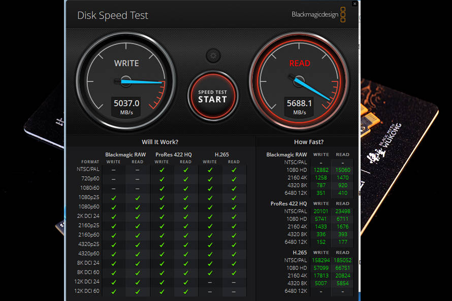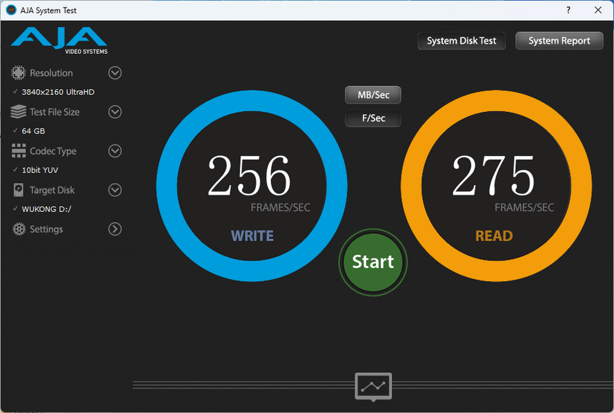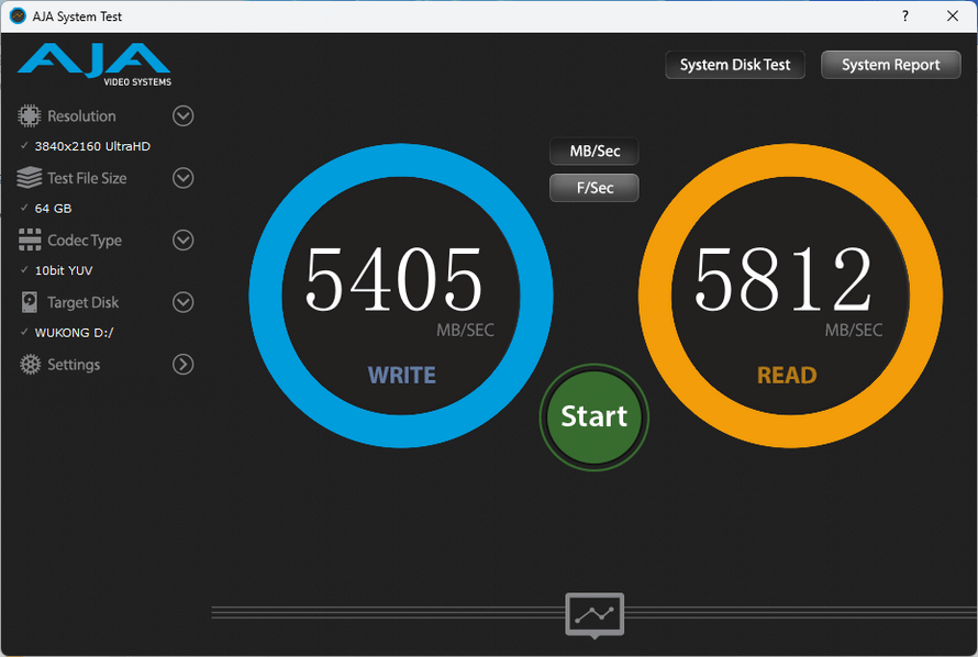 最后是AJA System Test以及BlackMagic Disk Speed Test两款测试软件,它们能够模拟不同分辨率、编码、码率的视频,测试SSD、存储卡的读写性能。AJA System Test设定为4K分辨率,64GB文件大小,10bit YUV编码,实测写入速度为5405 MB/s或256 FPS,读取速度为5812 MB/s或275 FPS。