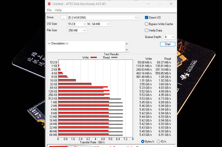 而在ATTO测试中,致态TiPlus7100悟空联名版顺序写入速度可达5.53 GB/s(@256KB、512KB文件大小),顺序读取为6.94 GB/s(@2MB、4MB、8MB、16MB文件大小;随机写入、读取分别可达125.69K IOPS(@4KB文件大小)、149.07K IOPS(@4KB文件大小),随机读写性能非常突出。