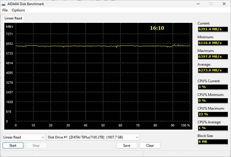 接下来是使用AIDA 64测试致态TiPlus7100悟空联名版在空盘情况下性能表现与SLC缓存大小,测试所用的是2TB版本,在Windows系统中显示的容量为1907.7GB,全盘读取耗时为16分10秒。