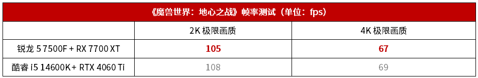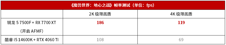 因此,如果玩家要打造一套主流性能机主机来实现4K畅玩《魔兽世界:地心之战》,那锐龙5 7500F + RX 7700 XT确实是同档次下性价比最高的解决方案。