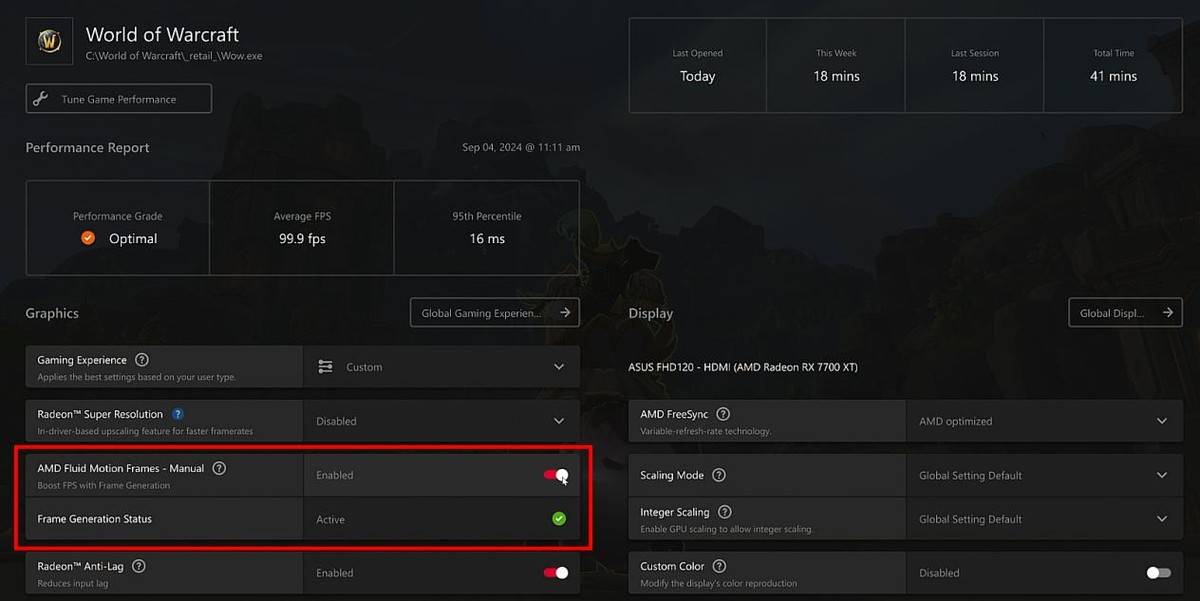 此外,对于追求性价比的主流玩家来讲,AMD处理器配上AMD独显也是非常经典的3A组合装机方案。例如锐龙5 7500F和Radeon RX 7700 XT搭配就特别适合用来畅玩2K游戏大作,包括《魔兽世界:地心之战》。Radeon RX 7700 XT采用RDNA 3架构,配备192bit/12GB GDDR6显存,可以在AMD Software控制面板中开启适用于绝大多数全屏游戏的AFMF(帧生成)功能,从而在《魔兽世界:地心之战》中获得巨大的帧率提升。而相同定位的酷睿i5 14600K + RTX 4060 Ti组合就没办法在《魔兽世界:地心之战》中享受帧生成了,毕竟包含帧生成功能的DLSS 3需要开发的时候就集成在游戏中才行,而《魔兽世界:地心之战》并不支持DLSS 3。另外,与RX 7700 XT同价位的RTX 4060 Ti只有8GB显存且仅支持PCIe 4.0×8通道,比RX 7700 XT少了一半,也就意味着RX 7700 XT在应对高分辨率游戏时的表现会更好。