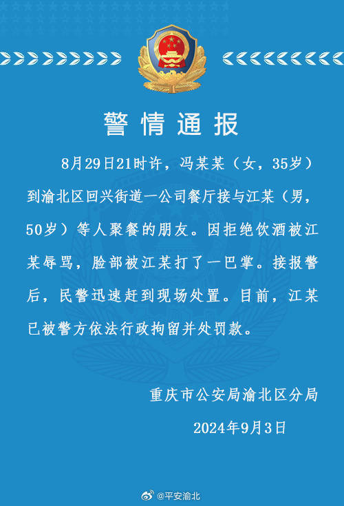 重庆警方通报“女子拒饮酒被辱骂打巴掌”:打人男子已被行拘