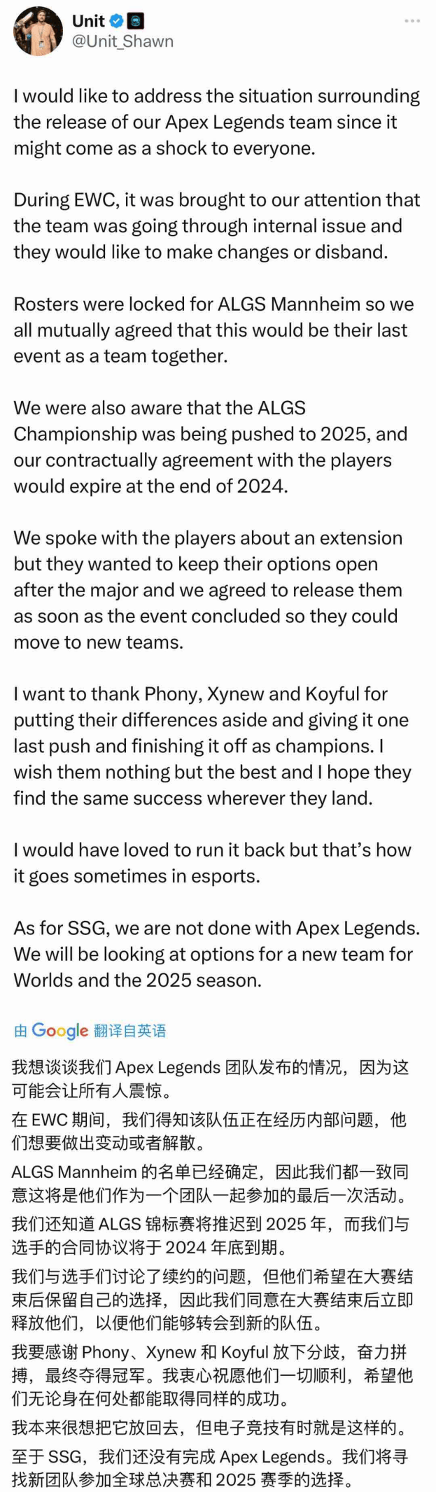 虽然这起事件听上去非常离谱,但还是能够解释得通的。SSG战队经理Unit,后续就在个人的推特账号上发布了动态,解释事件的原由。他表示三人的矛盾,早在之前的沙特电竞世界杯中就已经暴露出来。只是碍于季后赛名单已经确定,这才继续打比赛。