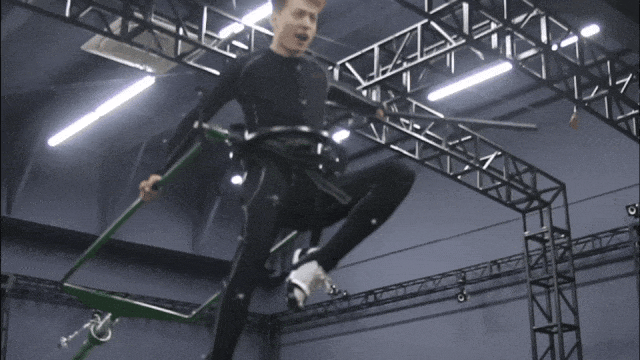 动作捕捉演员殷凯身着动捕服正在进行拍摄。受访者供图