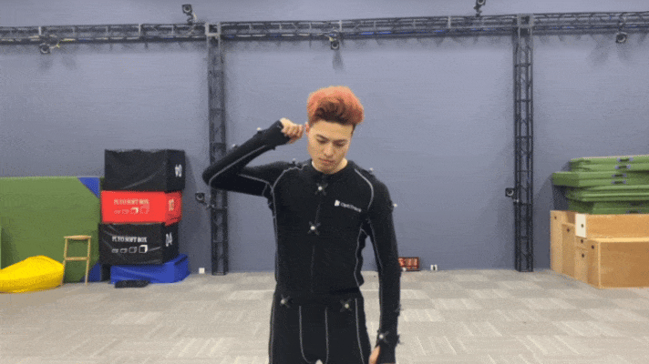身穿黑色动捕服,全身粘上反光点,在特定的空间范围内做扮演角色的动作,是殷凯的工作日常。