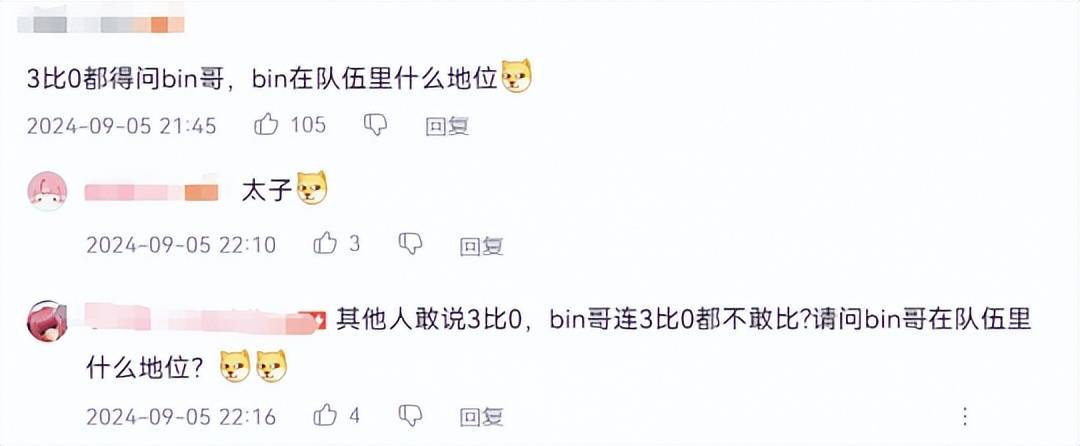 光就这个小插曲,网友都能打趣到:“3比0都得问bin哥,bin在队伍什么地位”,“其他人敢说3比0,bin哥连3比0都不敢比?请问bin哥在队伍里什么地位?”完全不敢想如果3比0真出现了,这个节奏会有多大。