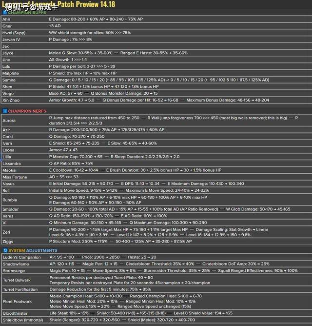 首先来看一下这一次的英雄削弱,14.18削弱了阿萝拉,沙皇,飞机,翠神,蕾欧娜,莉莉娅,冰女,大树,女枪,狗头,芮尔,兰博,小火龙,韦鲁斯,蔚,泽丽,炸弹人。其中有很多英雄都是lck的招牌,比如中单的沙皇,大招伤害直接后期掉了125点,并且还下降了15%的法术强度。飞机的q技能从二级开始也降低,丽桑卓q技能的AP加成下降了10%,这段时间lck大火的狗头,E技能的基础伤害和每秒伤害也都进行了削弱,上单兰博基本上不会出现在世界赛的舞台了,Q和E技能的伤害都下降了。