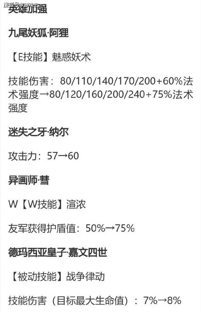 加强的英雄有狐狸,纳尔,辅助慧,皇子,贾克斯,杰斯,金克丝,露露,石头人,萨米拉,佛耶戈,慎,赵信。狐狸和杰斯的加强确实对lck赛区有所提升,毕竟这两个英雄在lck的地位非常的高,尤其是杰斯,但这一次对杰斯的加强并不是伤害的,只是q技能的减速和e技能的加速提升,当然,这个提升对于拉扯来说也是十分关键的。这一次,加强主要还是在野区,赵信,破败王,皇子这三个英雄,应该会成为世界赛的热门。