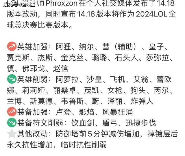 就在最近,拳头官方的设计师也是正式宣布了世界赛版本14.18的更新细节,之前就有很多的人透露,世界赛版本是为lck赛区定制的版本,更新的内容将会再次加强T1战队,但从设计师这一次的公布来看,大家都想错了。基本上是平衡了很多的英雄faker最喜欢的沙皇也受到了一定的削弱,尤其是后期的大招伤害,想要简单的完成单杀是很困难的。如果说这一次还有lpl赛区的玩家说为lck定制版本,那真的就是不看比赛了。