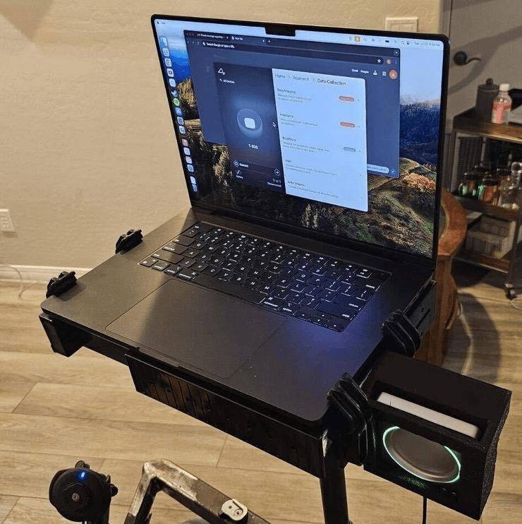 笔记本电脑右侧是他使用Link设计的3D打印充电器支架