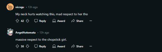 视频中,失去双臂的Up主只用嘴叼着一根筷子控制攻击移动、躲避、吃药等全部操作,精准掌握了躲闪和攻击的时机。老练的动作令不少玩家称呼她为“女武神”,还有玩家自愧不如“用嘴玩得比我用手还好”。残疾女孩阿喵展现出的坚韧和乐观也感染了很多网友。