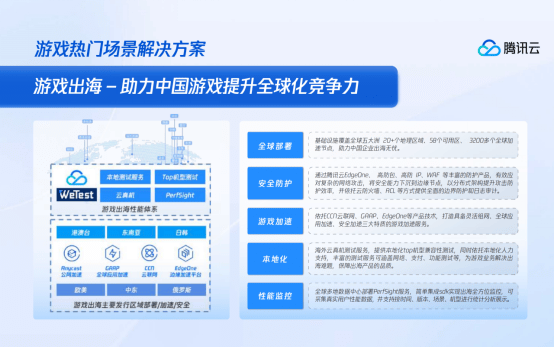 但面对境外网络环境复杂,基础设施和IDC机房质量参差不齐的问题,对追求低网络延迟和良好网络安全环境的游戏企业而言,出海路上依旧遍布“暗礁”。在此背景下,腾讯云聚焦出海场景,凭借全球部署、安全防护、游戏加速、本地化、性能监控五大能力,助力多款中国游戏稳健出海。